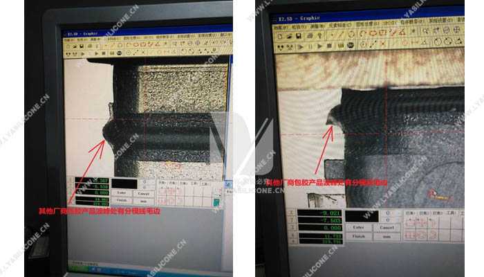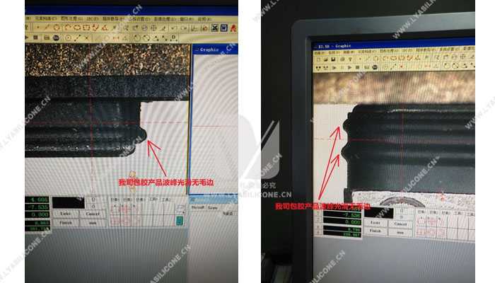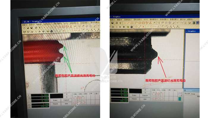 防水件產品主要是利用硅膠防水圈波峰彈性擠壓與配合件密封,從而達到防水目的。因此除了波峰外形尺寸至關重要,還有就是波峰處盡量要保持光滑完整,不可有毛邊或其它瑕疵(會影響產品防水穩定性和時效性。在同樣條件下,波峰無毛邊產品比波峰有毛邊產品防水穩定性和時效性大大提高)。因此我司在模具結構設計時會盡量避免在波峰處產生毛邊。以下圖為例:
