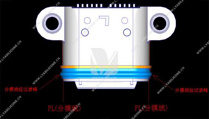 這種分模方式雖然模具容易加工,尺寸容易控制,但這種分模方式會在硅膠波峰處產生分模線毛邊,給產品防水功能留下隱患(防水等級不高的產品可以采用)。