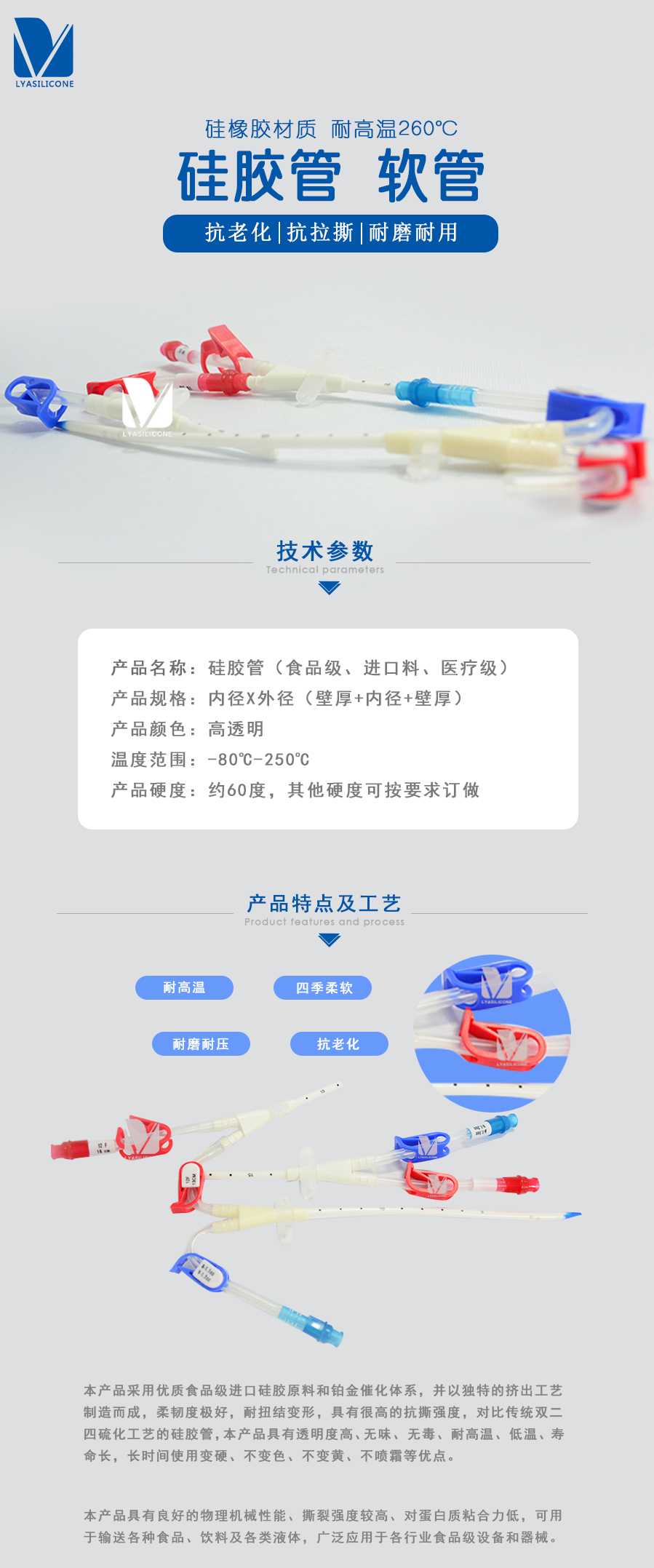 本產(chǎn)品采用優(yōu)質(zhì)食品級進(jìn)口硅膠原料和鉑金催化體系,并以獨(dú)特的擠出工藝制造而成,柔韌度極好,耐扭結(jié)變形,具有很高的抗撕強(qiáng)度,對比傳統(tǒng)雙二四硫化工藝的硅膠管,本產(chǎn)品具有透明度高、無味、無毒、耐高溫、低溫、壽命長,長時間使用變硬、不變色、不變黃、不噴霜等優(yōu)點。